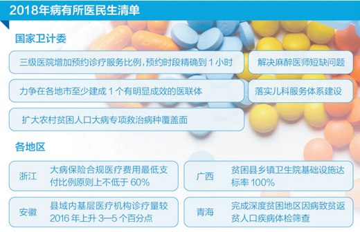 在地方,河南所有二级公立医院和政府办基层医疗卫生机构将全部参与医联体建设,安徽医共体建设要实现全覆盖;北京、江苏、黑龙江将实施统一的城乡居民医保制度;青海将完成深度贫困地区因病致贫返贫人口疾病体检筛查……实现“病有所医”关系千家万户,目前,多省份正陆续出台惠民政策,缓解看病难、看病贵问题。(记者 白剑峰)